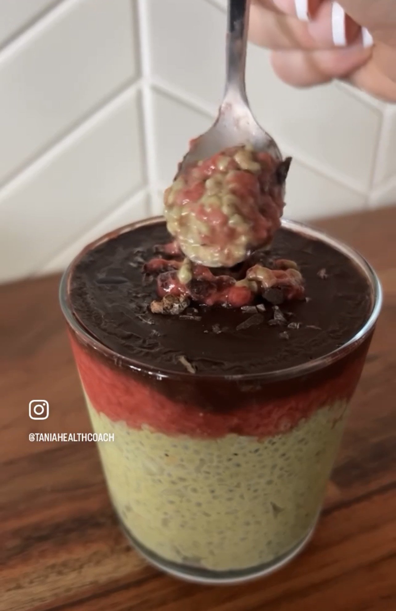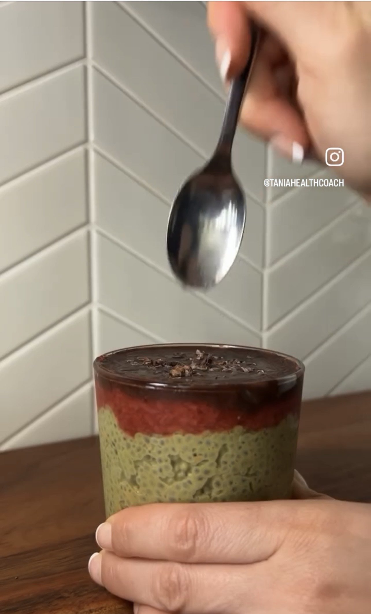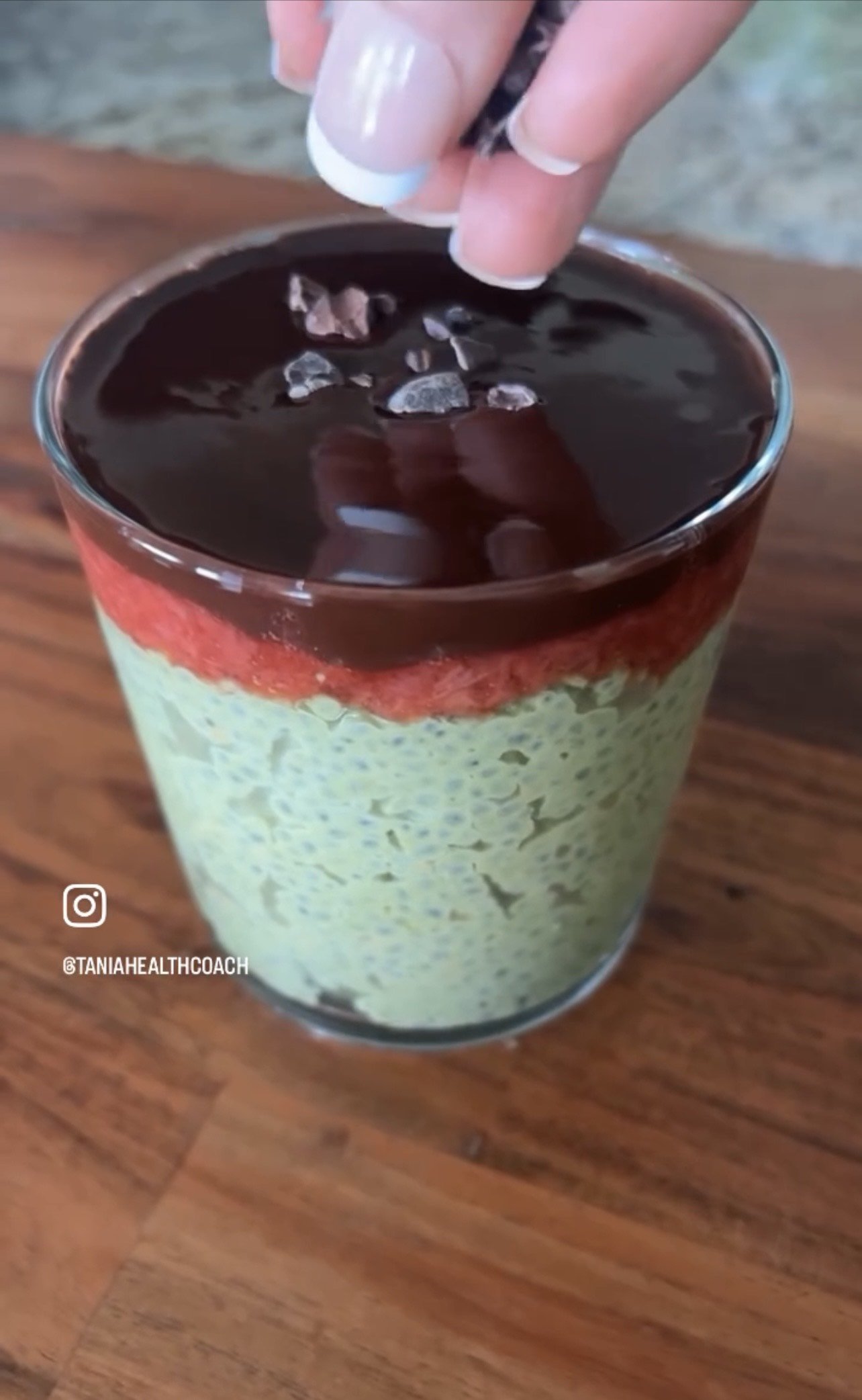 Pudin de chia con matcha, fresas y costra de chocolate